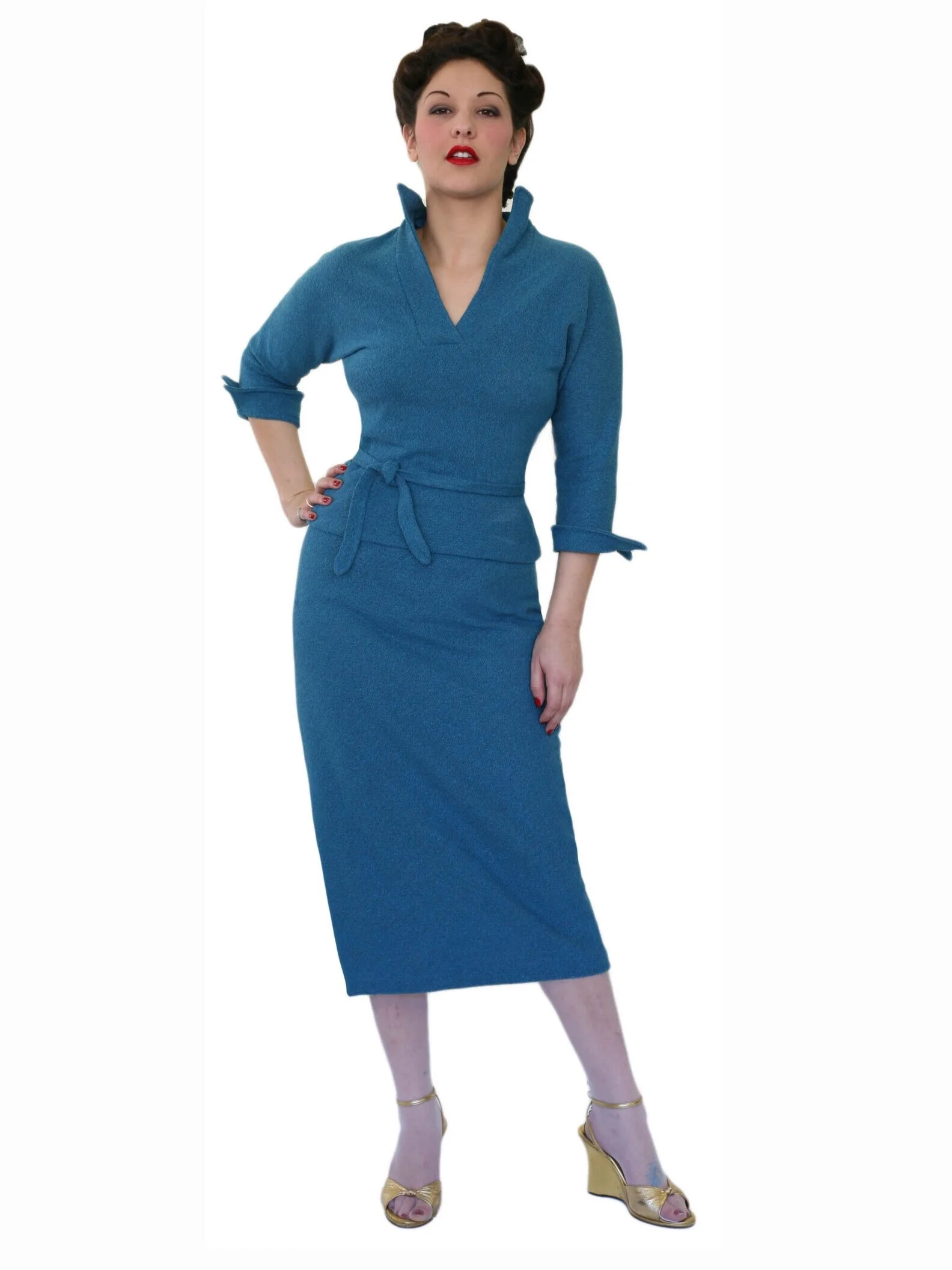 This provocative 50s inspired knit set is puts the "sin" in insinuation. Stitched in a bewitching periwinkle rayon-acetate knit, Lulu celebrates a woman's best assets. The beguiling bodice has slim dolman sleeves with turned up cuffs, snug peplum and belt. The mitered stand up collar frames the face.